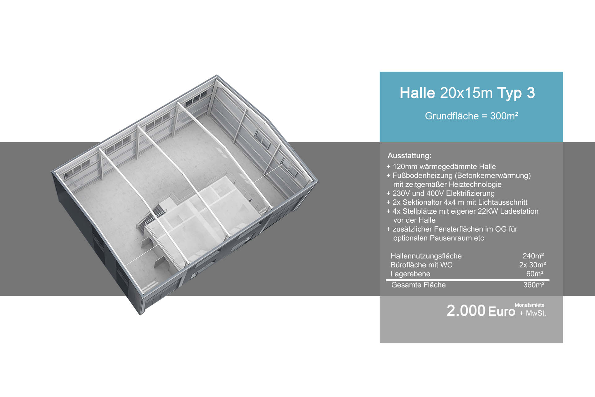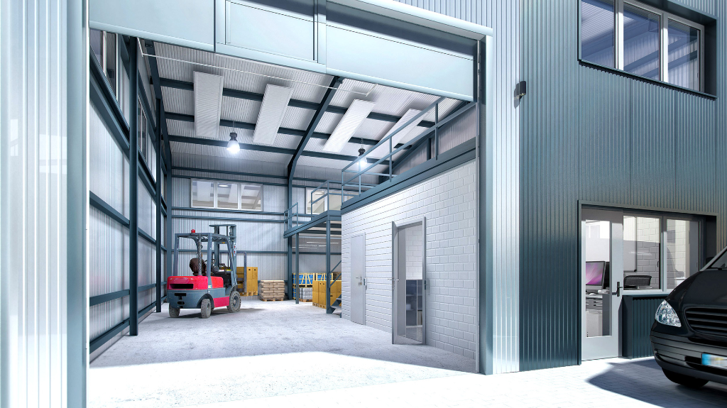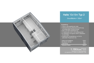 Die Grundfläche einer qualitativ hochwertigen Gewerbeeinheit beträgt ca. 150m² und kann mit weiteren Einheiten problemlos kombiniert und erweitert werden. Sie besteht grundsätzlich aus einer 6,5 m hohen Halle und einem 4 x 4 m großem Sektionaltor mit doppeltem Lichtausschnitt. Die ca. 30 m² großen Officeeinheit bestehend aus Büro, kleiner Küche und Toilette.
